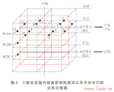 圖2繪出了三維反應(yīng)釜內(nèi)部各層電阻率測點以及開采井口的分布示意圖。從圖2中可以看出,共有l2×3個電阻測點以及分別位于A、C兩層的中心水平井。本實驗中,反應(yīng)釜注熱井為底層水平C井,出口為與注熱井在同一垂直截面上的頂層水平A井。實驗中,壓力由Trafag制造的NAT8251.7425型壓力傳感器測量,測量范圍為0~25MPa,精度為±0.02MPa。溫度由Ptl00鉑電阻測量,測量范圍為-20~200℃,精度為±0.1℃。蒸餾水由平流泵注入,通過中間容器,經(jīng)過加熱罐后被加熱為高溫蒸汽進入釜內(nèi)。平流泵為北京創(chuàng)新通恒有限公司制造的P3000型,流量范圍為0~50mL/min,精度為±0.001mL/min,壓力范圍為0~25MPa。加熱罐由南通飛宇有限公司制造,可加熱水至30~190℃,精度為±0.1℃。供氣部分包括甲烷氣瓶、壓力調(diào)節(jié)閥、穩(wěn)壓器、氣體流量計等,氣體流量計采用北京七星D07型質(zhì)量流量控制器,量程為0~10L/min,測量精度為l%。’實驗所用氣體為99.9%的純甲烷氣體,由佛山華特氣體有限公司提供。