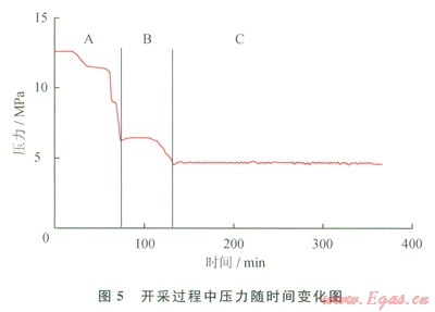 圖5為開采過程中系統(tǒng)壓力隨時間變化圖。如圖5所示,根據(jù)壓力的變化可以把整個開采階段分為3個階段,分別為階段A、階段B和階段C。其中,在階段A中,壓力由生成結(jié)束時的12MPa降低至6.5MPa,而6.5MPa高于此時水合物藏溫度8℃所對應(yīng)的相平衡壓力(5.6MPa),也就是說在階段A中水合物并不分解,所以此階段被稱為自由氣釋放階段。在階段8中,壓力由6.5MPa降低至4.7MPa,在此階段中,由于系統(tǒng)壓力低于相平衡壓力導致水合物開始分解,所以此階段被稱為降壓開采階段。在階段C中,壓力穩(wěn)定在4.7 MPa附近幾乎不變,并且開始通過水平井C注熱開采水合物,所以此階段被稱為注熱開采階段。