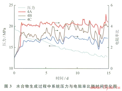 此外,還可以發(fā)現(xiàn)由A層至C層,電阻率的升高量逐漸降低,表明水合物生成量依次減少。這主要是由于在水合物生成過程中反應(yīng)釜內(nèi)的水的分布是不均勻的,由于重力的原因,下層(C層)的水的飽和度較高,相對來說氣水接觸面較小,所以水合物更難生成。