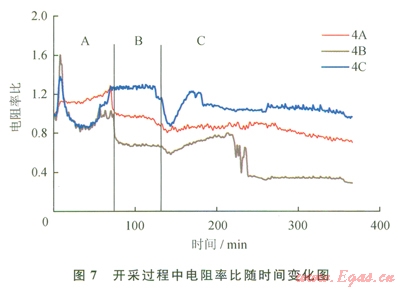 下面研究一下這些開采現(xiàn)象所對應(yīng)的電阻率變化規(guī)律。仍然以4A、4B和4C測點的電阻率為例,研究開采過程中電阻率的變化。圖7為開采過程中電阻率隨時間變化曲線。如圖7所示,在自由氣釋放階段A中,首先由于自由氣的大量放出,導致中層4B和下層4C電阻率下降較為明顯,而在上層4A測點電阻率反而略有上生,這表明氣體通過上層水平井流出,導致各層電阻率變化,并且在自由氣釋放階段的后期由于產(chǎn)水導致中、下層電阻率的上升;在降壓開采過程中,由于水合物分解導致電阻率緩緩下降,但是不明顯,這主要是由于降壓分解降低水合物飽和度,但是并未降低至上文中提到的可以明顯影響電阻率的水合物飽和度值,所以下降并不明顯;在注熱開采初期,由于大量水合物分解導致氣體和水的流動性較大,所以水合物藏內(nèi)的電阻率變化具有一定隨機性,不過隨著注熱的進行,水合物逐漸分解完,導致電阻率總體呈下降趨勢。