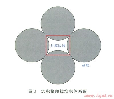 由于沉積物孔隙內(nèi)水合物實(shí)際生成過程比較復(fù)雜,因而模型對(duì)物理過程進(jìn)行了簡(jiǎn)化,假定所有沉積物顆粒都為正網(wǎng)形且粒徑分布均一,沉積物體系內(nèi)各向同性。自然界中,沉積物層位于海底,由于海水和沉積層的壓力,沉積物顆粒被壓實(shí),孔隙水充填于沉積物孔隙內(nèi)部,氣體溶解于填充的孔隙水中。沉積物顆粒間彼此錯(cuò)落排列,形成沉積物間孔隙的是顆粒的圓弧面,計(jì)算區(qū)域的邊界為沉積物顆粒的弦長(zhǎng),如圖2所示。邊界條件采用反彈邊界。