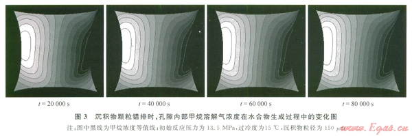2)介觀尺度模型主要研究的是沉積物顆粒組成的孔隙,以孔隙水中溶解氣體的濃度為變量,模擬了由沉積物顆粒組成的單個(gè)孔隙內(nèi)水合物的生成過程。結(jié)果表明,在沉積物顆粒體系內(nèi)部,孔隙面相對(duì)比較平整,水合物先在沉積物壁面生成,而后沿著壁面法線方向增長(zhǎng),水合物在生成過程中呈層狀生成,最后在孔隙中間會(huì)合,從而充滿整個(gè)沉積物孔隙。