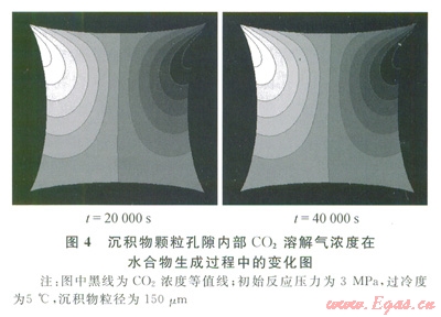 首先,實(shí)驗(yàn)采用的沉積物并非是孔徑為150mm的均一顆粒,而是介于l50~250mm的區(qū)間,因此,形成的顆粒間的孔隙尺寸也就不統(tǒng)一,孔隙尺寸分布呈一定區(qū)間,對(duì)孔隙空間內(nèi)水合物生成過程的影響也就不盡相同,而模型模擬的是沉積物粒徑為l50mm的孔隙空間,孔隙尺寸是恒定的。其次,實(shí)際實(shí)驗(yàn)過程中,氣體與沉積物體系的交界面處最容易生成水合物,同時(shí),界面處的水合物容易通過毛細(xì)作用將沉積物體系內(nèi)孔隙水運(yùn)移到水合物周圍,而水合物生成區(qū)域的擴(kuò)散傳遞作用是最強(qiáng)烈的。氣體的擴(kuò)散時(shí)刻都在發(fā)生,可能直接擴(kuò)散進(jìn)入沉積物孔隙水里,也可能直接擴(kuò)散進(jìn)入水合物中,生成水合物,而模型的假設(shè)是氣體必須首先擴(kuò)散進(jìn)入沉積物孔隙水中,再?gòu)目紫端型ㄟ^水合物膜表面擴(kuò)散生成水合物。因此,綜合考慮,模擬結(jié)果與實(shí)驗(yàn)結(jié)果存在一定的偏差,但誤差比較小,誤差范圍為3%~7%,模型結(jié)果基本可靠。