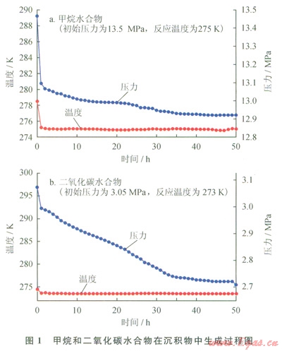 在進(jìn)行數(shù)值模擬之前,對(duì)甲烷和二氧化碳?xì)怏w水合物的生成過程先進(jìn)行了實(shí)驗(yàn)室模擬,實(shí)驗(yàn)?zāi)M裝置主要由管路、氣瓶、增壓裝置、真空泵、恒溫水浴和反應(yīng)釜組成,具體見本文參考文獻(xiàn)[12]。沉積物樣品選用南海淺表層沉積物,人工進(jìn)行清洗并干燥,后進(jìn)行篩分,按照一定的粒徑進(jìn)行分類。本次實(shí)驗(yàn)粒徑分布介于60~100目的沉積物,測(cè)得其孔隙度為36.7%。甲烷水合物和二氧化碳水合物生成過程分別在不同的溫度和壓力條件下進(jìn)行,觀測(cè)水合物生成過程中體系內(nèi)溫度和壓力的變化。實(shí)驗(yàn)結(jié)果如圖1所示。