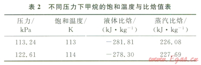 由于LNG的主要成分為甲烷,所以采用純甲烷的物性參數(shù)來確定hL和hBt[14]。而國內(nèi)常壓全容式混凝土頂儲(chǔ)罐的設(shè)計(jì)壓力一般為-0.50~29.O0kPa(表壓),冷卻時(shí)的壓力通常控制在111.32~l21.32kPa(絕對(duì)壓力)。表2列出了不同壓力下甲烷的飽和溫度與比焓值,從表2不難看出壓力在l13.24~122.6lkPa時(shí),蒸汽比焓的變化較小,所以取其對(duì)應(yīng)液體比焓的平均值作為hL值,即hL為-280.06kJ/kg。