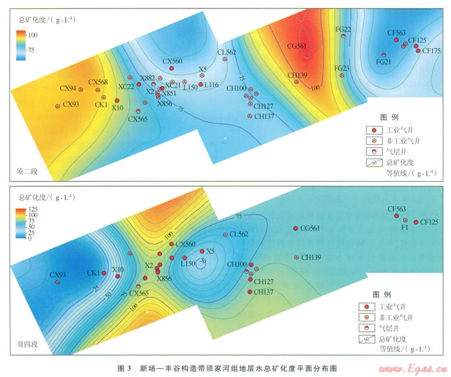 從平面上看,須二段現(xiàn)今氣藏氣井多位于地層水總礦化度大于75g/L的高礦化度區(qū)域,更有利于水溶脫氣;須四段現(xiàn)今氣藏則正好相反,氣井多位于地層水總礦化度小于75g/L的地區(qū),才會(huì)出現(xiàn)多數(shù)鉆井產(chǎn)水或氣水同產(chǎn)的局面。
