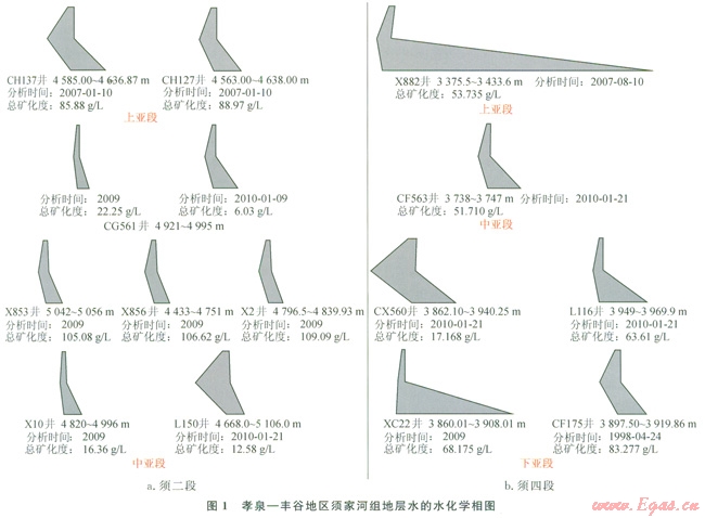 須四段的地層水相圖(圖1)表明地層水分布橫向連通性差,下亞段新場(chǎng)、豐谷地區(qū)各不相同,但各構(gòu)造部位縱向上地層水相圖有一定的相似性。新場(chǎng)地區(qū)XC22井下亞段與X882井上亞段地層水相圖特征相似,豐谷地區(qū)CF563中亞段與CFl75下亞段相岡特征相似。X882井區(qū)斷層發(fā)育,而豐谷地區(qū)斷層不發(fā)育,可見須四段氣水運(yùn)移不僅依靠斷層、裂縫等快速通道,同時(shí)存在垂向運(yùn)移。