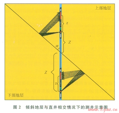 圖2顯示了傾斜地層與直井相交情況下的測井。由傾斜地層產(chǎn)生的反射波按照傳播方向可分為上行反射波和下行反射波。設地層與井的夾角是a,反射波旅行時表達式為: