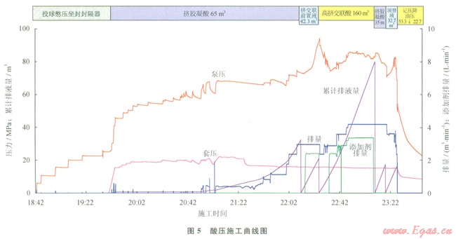 利用實驗確定了典型地質體的響應特征,以該響應特征為依據(jù)對實際井數(shù)據(jù)進行解釋,建立一系列的特征圖集或解釋圖版,在后續(xù)生產(chǎn)中可以用圖版對測井資料進行解釋[12-13]。圖4是塔里木油田A井的一段碳酸鹽巖段綜合解釋成果圖。從圖中可以看出XX20~XX30m井段,成像測井在XX26m解釋一條40cm高的裂縫,孔隙度小于1.8%,電阻率大于1000W·m,綜合評價為Ⅲ類儲集層,開井流動曲線呈一條直線,關井壓力恢復緩慢,壓力歷史曲線反映測試層為特低滲透性儲集層,僅從常規(guī)分析這類儲集層即使酸化壓裂也不會獲得工業(yè)油氣流。而對應遠探測成像圖上可以看出在XX20~XX28m距井壁3~10m的地方發(fā)現(xiàn)反射信息比較明顯,為雙邊成像,同相軸幾乎為直線,但兩側的同相軸延長線在在一條線上,裂縫角度較高,根據(jù)圖版可以評價為高角度井旁裂縫。建議中國石油塔里木油田公司勘探公司進行試油,該建議被采納,酸壓后6mm油嘴日產(chǎn)氣l0多萬立方米、油l0多立方米。從圖5酸壓施工曲線分析,擠膠凝酸注入過程壓力平穩(wěn)上升,人造裂縫正常延伸,沒有溝通儲層縫、洞的跡象;再次擠膠凝酸后,壓力有明顯下降,說明溝通了縫洞系統(tǒng)。從圖6裂縫導流能力曲線圖上分析在裂縫延伸方向8m處遇到溶洞區(qū),在36m處穿過溶洞區(qū)。證實遠探測聲波反射波成像解釋是正確的。