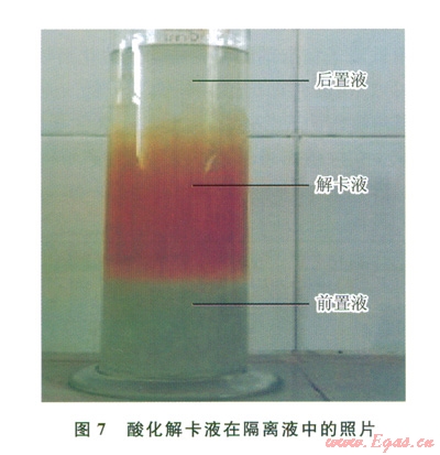 隔離液的作用是將解卡液和鉆井液隔開,防止竄漿,避免引起鉆井液性能變化太大,確保解卡液的酸化效果,通常使用增黏劑來配置,做了隔離液與酸化解卡液配伍性實(shí)驗(yàn),放置時(shí)間為24h[11](圖7),可以看出酸化解卡液與隔離液配伍性較好。