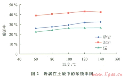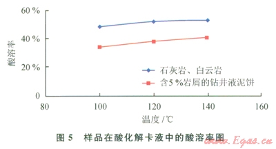 石灰?guī)r、自云巖與含5%巖屑的鉆井液泥餅在酸化解卡液中的溶蝕規(guī)律與在鹽酸中基本一致,隨溫度增加溶蝕率增加,溫度從100℃增加到l40℃時(shí),巖屑在酸化解卡液巾的溶蝕率約50%;含巖屑中的泥餅在解卡液中的溶蝕規(guī)律(巖屑為石灰?guī)r),隨溫度增加溶蝕率增加,溫度能夠輕微提高其溶蝕率,溫度從100℃增加到140℃時(shí),溶蝕率從34%提高到41%。因此可以看出,酸化解卡液的酸化效果是可以得到保證的[9]。