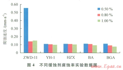 酸化緩蝕劑一般屬高分子有機(jī)化合物,這種化合物由極性基團(tuán)和非極性基團(tuán)構(gòu)成,可在金屬表面做定向吸附,形成分子界面膜,阻擋腐蝕介質(zhì)接觸金屬表面,達(dá)到保護(hù)設(shè)備,減緩腐蝕的目的[6]。能夠迅速有效地阻止酸性介質(zhì)對(duì)設(shè)備的侵蝕,對(duì)單酸(鹽酸、氫氟酸、磷酸)和復(fù)合酸均有良好的緩蝕效果。酸化解卡液選用鹽酸作為基液。因此,必須考慮鹽酸對(duì)現(xiàn)場(chǎng)設(shè)備的腐蝕問題。通過加入一定量鹽水緩蝕劑來抑制鹽酸對(duì)金屬設(shè)備的腐蝕。在一定實(shí)驗(yàn)條件下分別考察5種緩蝕劑加量(圖4)在0.5%、0.8%和l.0%的情況下對(duì)金屬掛片的腐蝕性來評(píng)價(jià)其緩釋性能。