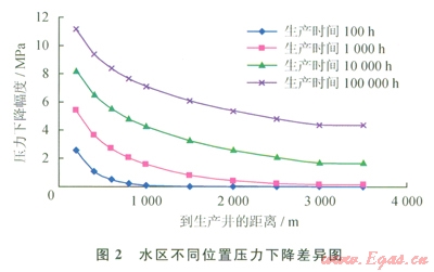 通過理論計算能了解水區(qū)不同位置壓力下降幅度的差異。圖2展示的是一個理論計算結果,儲層滲透率為10mD,裂縫發(fā)育帶水侵通道寬度為1000 m,水侵速度為l000m3/a。從圖2可看出,只要觀察井離生產井足夠遠,其井底靜壓力基本能代表水區(qū)平均地層壓力。否則,需要根據類似于式(5)的計算模型推算離生產井更遠處的靜壓力。由于滲透性較好的氣藏開發(fā)井距通常都大于lkm,圖2顯示在這種條件下壓差與觀測點到生產井的距離大體呈線性關系,近似直線段的斜率與滲透率、水侵速度等相關。根據這種認識,可基于少量的理論計算得到近似的經驗關系式,在觀察井實測靜壓力基礎上作修正,從而獲得更好的代表水區(qū)平均地層壓力的數據。