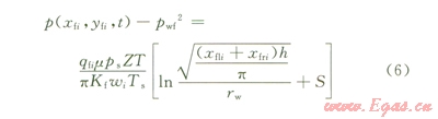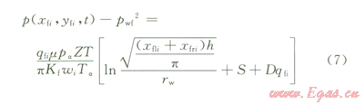 第i條裂縫就可以看成是一個(gè)以流動半徑為Ri,厚度為裂縫寬度wi,邊界壓力為裂縫尖端壓力p(xfi,yfi,t),滲透率為Kf,流壓pwf的微型氣藏,其流動方式可以看成徑向流,所以氣體在裂縫內(nèi)的流動過程可表示為: