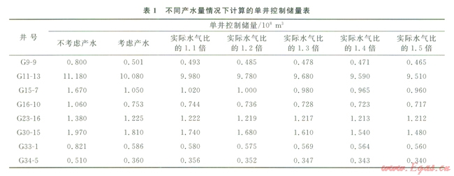 從上述圖表中可以看出:首先,不考慮產(chǎn)水情況的氣井控制儲(chǔ)量要高于產(chǎn)水的情況,出水對(duì)儲(chǔ)量的影響顯而易見;其次,考慮產(chǎn)水時(shí),計(jì)算的儲(chǔ)量的降幅明顯加大。從計(jì)算結(jié)果可得出,考慮產(chǎn)水后,氣井控制量平均降低23.84%;產(chǎn)水情況下,越高,水量越大,相應(yīng)地氣井控制儲(chǔ)量也越低,水氣比每增大0.1倍時(shí),氣井控制儲(chǔ)量將平均降低0.9%~l.2%。