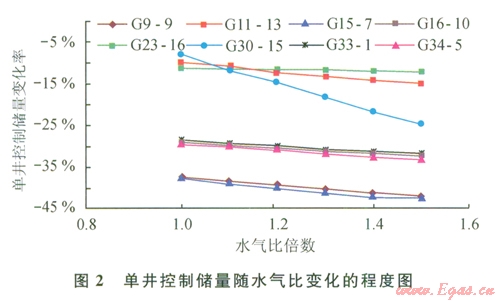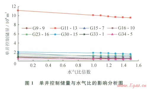 式中A、BC、DE、F分別為氣井氣相或水相的產(chǎn)能方程系數(shù),WGR為水氣體積比。通過(guò)該式就可求出氣井的控制儲(chǔ)量Go從上式可以看出:WGR越大,其單井控制儲(chǔ)量就越低。所以,控制好氣井的出水,就能提高氣井的產(chǎn)能,從而提高氣井對(duì)儲(chǔ)量的控制程度。