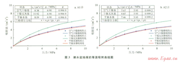 蘭氏體積反映了煤的最大吸附能力,蘭氏壓力反映煤層氣解吸的難易程度,值越高,煤層中吸附態(tài)氣體脫附越容易,越有利于開發(fā)跚。從Al、A2井的等溫吸附曲線上看(圖3),潮水盆地煤的蘭氏體積為7.46~10.92m3/t,對(duì)煤層氣的吸附能力強(qiáng);而蘭氏壓力介于5.95~6.90MPa,值較高,利于煤層氣的解吸。