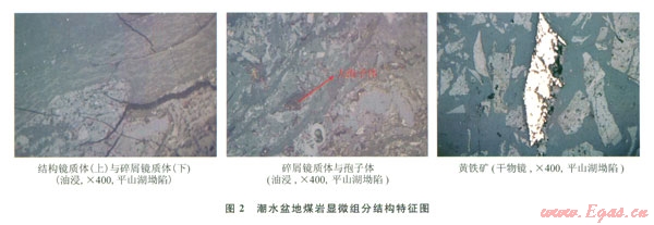 潮水盆地宏觀煤巖類型以暗淡煤半晴煤為主。偏光顯微鏡下觀察(圖2),該區(qū)煤層惰質(zhì)組含量偏高,在成煤母質(zhì)器官或細(xì)胞的胞腔內(nèi)填充有黏土礦物,并含有黃鐵礦、石英、黏土等礦物,反映了當(dāng)時(shí)成煤環(huán)境比較復(fù)雜多變。煤巖鑒定分析表明,該區(qū)煤層鏡質(zhì)組含量介于29.0%~89.5%、平均為52.5%;惰質(zhì)組含量介于10.9%~55.2%、平均為38.9%;殼質(zhì)組含量偏高,為l.1%~l4.5%。