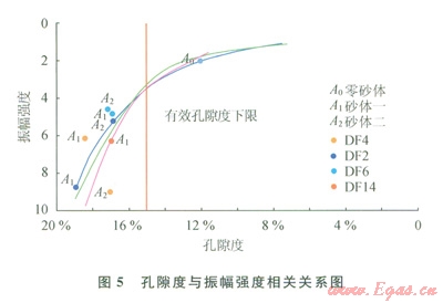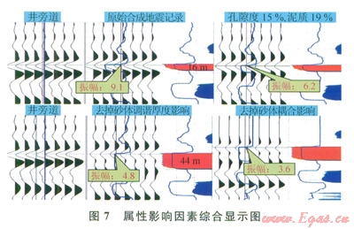 研究結(jié)果顯示(圖5),泥質(zhì)含量增加后,總孔隙度隨之降低,巖石速度及密度也應(yīng)該隨之增加。即當(dāng)儲層物性變差,儲層反射強(qiáng)度降低。如圖5所示,多口井測井曲線擬合趨勢基本相同。將各井實(shí)鉆儲層頂面振幅其他因素的影響剔除后,實(shí)鉆振幅值與正演模擬趨勢基本吻合。證明該規(guī)律可以代表真實(shí)物性變化條件下的地震反射變化情況。同時,該研究結(jié)果可以將地震振幅大小與物性下限(15%)相對應(yīng),當(dāng)不受調(diào)諧及其他因素影響的時候,真實(shí)氣層頂面反射振幅在3.5左右。所以對振幅強(qiáng)度低于3.5的區(qū)域在儲量計(jì)算時基于風(fēng)險(xiǎn)考慮,儲量級別相應(yīng)降低。