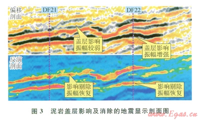 DFl3氣田平面分布達(dá)數(shù)百平方千米,儲層、蓋層橫向上變化較大。受沉積速度、厚度及壓實(shí)不均影響,泥巖蓋層的速度及密度在空間上存在較大差異。由此導(dǎo)致同一套氣層具有完全不同的地震響應(yīng)特征。當(dāng)存在致密泥巖蓋層時,致密泥巖旁瓣的波谷會與氣層頂面的波谷疊加,導(dǎo)致氣層頂面出現(xiàn)異常“亮點(diǎn)”;相反,當(dāng)蓋層是一套相對低阻抗泥巖時(本區(qū)蓋層阻抗均高于儲層),氣層頂面反射相應(yīng)減弱,從而導(dǎo)致對儲層含氣性的誤判。