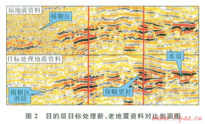 研究中消除這兩方面的影響岡素方法是:①開展地震資料目標(biāo)處理,提高地震資料的信噪比和目的層的資料相對保幅性(圖2);②改變常規(guī)反演只針對目的層段建模和反演的做法。本氣田反演從海底開始,嚴(yán)格利用所有淺層井資料開展包含淺層氣的建模,同時利用三維速度場資料來消除泥底辟區(qū)域的低速影響。通過精細(xì)目標(biāo)處理及速度約束補(bǔ)償反演,基本能夠消除淺層氣及泥底辟低速帶來的影響,儲層預(yù)測與深度預(yù)測與實(shí)鉆結(jié)果吻合較好。