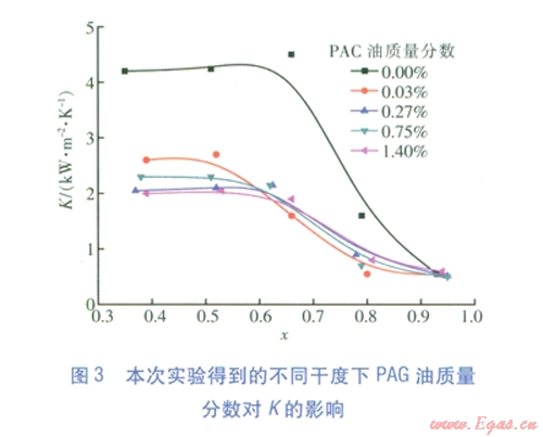 在設(shè)定實(shí)驗(yàn)條件下得到,小同工質(zhì)干度下PAG油質(zhì)量分?jǐn)?shù)對K的影響(見圖3)。由圖3可知,與無油工況相比,含油工況的K明顯下降。對于無油工況,在K急劇變化處干涸發(fā)生,并隨著工質(zhì)干度的增加,與含油工況的K差距縮小,最終趨于一致。
