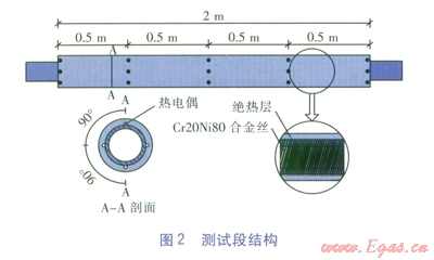 測試段為有效加熱長度為2m的半硬態(tài)水平光滑銅管(見圖2),內(nèi)直徑為4mm,外直徑為6mm,在測試段進(jìn)口、出口分別安裝壓力、溫度傳感器。在測試段每隔0.5m安裝熱電偶,以測量銅管外壁溫度,熱電偶用絕緣膠布固定在銅管外壁。電加熱絲采用直徑為045mm的Cr20Ni80合金絲,總電阻為82.5Ω,用于模擬蒸發(fā)器負(fù)荷。最外層設(shè)置絕熱層,起到固定和絕熱作用。電加熱絲與調(diào)壓器相連接,通過調(diào)節(jié)直流電壓來調(diào)節(jié)電加熱功率,改變測試段熱流密度。測試段熱流密度q的計算式為: