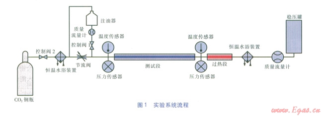 為了測試C0:一PAG油混合物(以下簡稱混合物)水平光滑管內(nèi)流動沸騰換熱特性,筆者設(shè)計搭建了實(shí)驗(yàn)臺(見圖l)。實(shí)驗(yàn)臺采用開式系統(tǒng),C02從鋼瓶中流出進(jìn)入恒溫水浴裝置進(jìn)行溫度調(diào)節(jié)和控制,模擬C02制冷系統(tǒng)中氣體冷卻器出口狀態(tài)。通過節(jié)流閥對C02進(jìn)行流量控制,并使節(jié)流閥出口處的C02以液霧形式出現(xiàn)。在節(jié)流閥出口設(shè)置注油器,通過管道連接節(jié)流閥入口和出口,產(chǎn)生壓差,連同重力作用,注油器內(nèi)的潤滑油可連續(xù)注入節(jié)流閥出口管內(nèi),并與C02充分混合。注油器出口安裝流量計,以測量潤滑油注入流量,控制閥1可調(diào)節(jié)PAG油注人流量。然后混合物進(jìn)入測試段(模擬蒸發(fā)器)。為準(zhǔn)確控制并測量C02的質(zhì)流密度(C02質(zhì)量流量與管內(nèi)截面積之比),在鋼瓶出口設(shè)置控制閥2(用于控制C02質(zhì)量流量),在測試段出口設(shè)置過熱段與恒溫水浴裝置(使C02完全氣化)及質(zhì)量流量計。