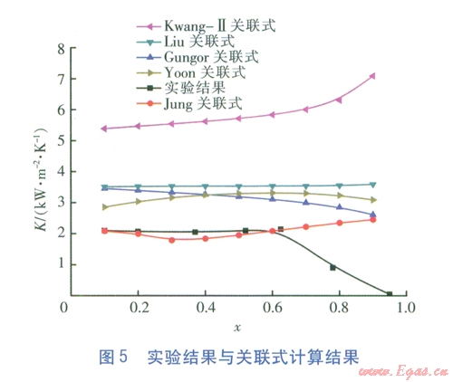 筆者選取5種經(jīng)典換熱關(guān)聯(lián)式,將本次設(shè)定實(shí)驗(yàn)條件(PAD油的質(zhì)量分?jǐn)?shù)固定為0.75%)作為已知計算條件,比較實(shí)驗(yàn)結(jié)果與換熱關(guān)聯(lián)式計算結(jié)果,從中篩選出適于計算混合物水平光滑管內(nèi)流動沸騰換熱系數(shù)的傳熱關(guān)聯(lián)式。