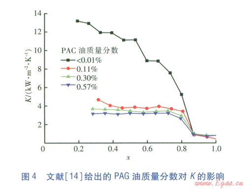L.Ga0等人[14]針對C02-PAG混合物,測定蒸發(fā)器的換熱性能,蒸發(fā)器采用不銹鋼水平光滑管,內(nèi)直徑為3mm。實(shí)驗(yàn)主要針對C02質(zhì)流密度與蒸發(fā)器負(fù)荷(熱流密度)較大的工況,實(shí)驗(yàn)條件為:C02質(zhì)流密度為380kg/(m2·s),蒸發(fā)器進(jìn)口C02飽和溫度為10℃,熱流密度為20kW/m2。實(shí)驗(yàn)得到,不同工質(zhì)干度下PAG油質(zhì)量分?jǐn)?shù)對K的影響(見圖4),將PAG油質(zhì)量分?jǐn)?shù)小于0.01%視為無油工況。由圖4可知,與無油T況比較,含油工況的K大幅度下降。隨著PAG油質(zhì)量分?jǐn)?shù)的增大,K逐漸減小,但減小的幅度不明顯。當(dāng)干洞發(fā)生時,無油工況、含油工況的K均出現(xiàn)明顯下降,并趨于一致。