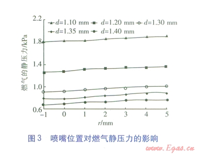 模擬的噴嘴位置對(duì)燃?xì)忪o壓力的影響見圖3。由圖3可知,噴嘴的直徑越小,燃?xì)馑枰撵o壓力越大。當(dāng)噴嘴的直徑d<1.30mm時(shí),燃?xì)獾撵o壓力大于1.0kPa。因此噴嘴的直徑應(yīng)大于1.30mm,否則電磁閥后(燃?xì)鈬娮烨埃┤細(xì)獾馁|(zhì)量流量將不能滿足燃燒器熱負(fù)荷的要求。