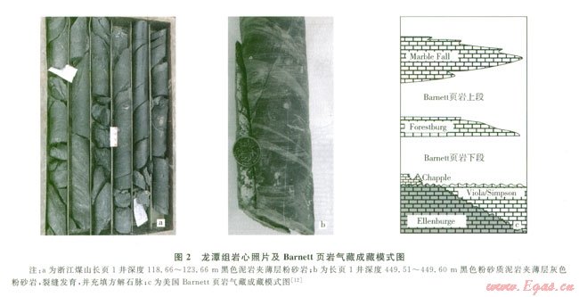 從表l中可以看出,龍?zhí)督M頁巖的TOC、R0、厚度以及地層的頂?shù)钻P(guān)系都較Lewis頁巖有更好的頁巖氣前景,而且從地層的頂?shù)钻P(guān)系來看(1),與美國Barnett頁巖所處的地層格局(2-c)有很大的相似性,有利于頁巖氣的后期保存。