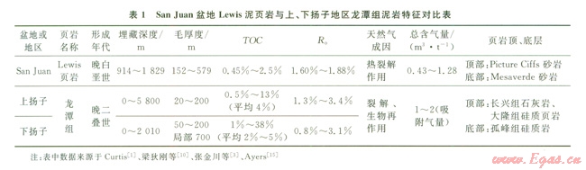 揚子地區(qū)龍?zhí)督M頁巖與美國San Juan盆地Lewis頁巖的沉積環(huán)境十分相似,故將各類參數(shù)進行對比總結(jié)(1)。