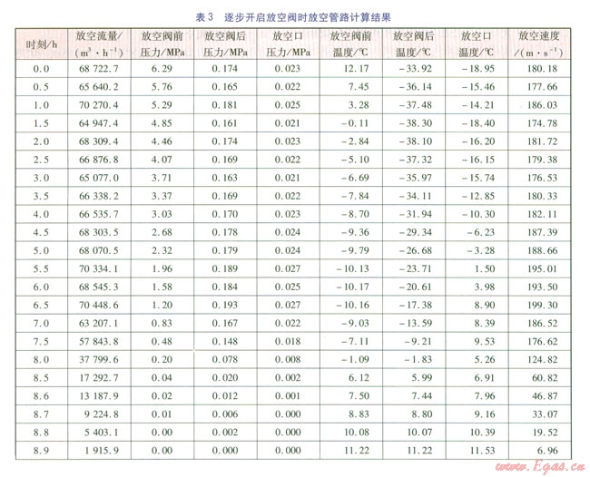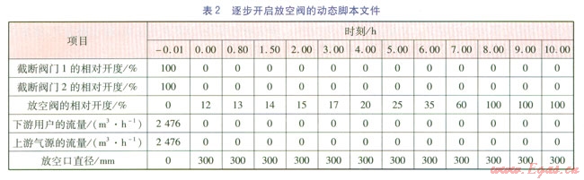根據(jù)放空模型,建立動態(tài)腳本文件。在0時刻截斷閥門l和截斷閥門2關(guān)閉,逐步開啟放空閥,放空口直徑為