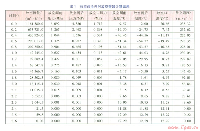 根據(jù)式(2),放空瞬間,由于干線管道內(nèi)壓力與環(huán)境壓力(即大氣壓力)的差值大,放窄初期放空流量大,管道內(nèi)天然氣瞬間膨脹成高速氣流,天然氣的焓轉(zhuǎn)化成動能,天然氣溫度急劇降低,可以達(dá)到