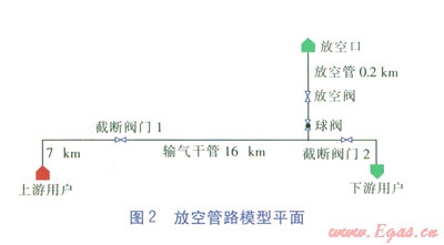 放空管路模型平面見圖2。已知:2個截斷閥門間為長16 km的ø813×13的輸氣干管,流量為2