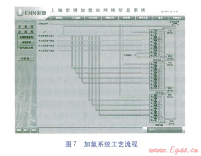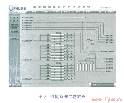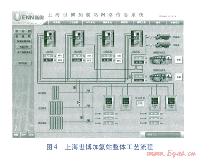 上海世博會專用燃料電池加氫站根據(jù)上述因素,加氫系統(tǒng)工藝流程見圖7。加氫機先從管束(0級瓶組)取氣,當(dāng)管束內(nèi)的氫氣壓力與汽車上的車載儲氣瓶壓力平衡時,停止從管束取氣;切換至低壓瓶組,開始從低壓儲氣瓶組取氣,低壓瓶組內(nèi)壓力與車載儲氣瓶內(nèi)壓力平衡時,停止取氣;切換至中壓瓶組,開始從中壓儲氣瓶組取氣,中壓瓶組內(nèi)壓力與車載氣瓶內(nèi)壓力平衡時,停止取氣;切換至高壓瓶組,開始從高壓儲氣瓶組取氣,高壓瓶組內(nèi)壓力與車載氣瓶內(nèi)壓力平衡時,停止取氣;如果還有車輛需要加氣,開啟壓縮機,壓縮機從管束內(nèi)取氣,進行增壓后,直接給加氫機供氣,直至汽車加滿氫氣,經(jīng)壓縮機增壓的氫氣按高、中、低壓瓶組順序向各儲氣瓶組充氣。