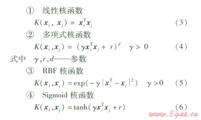 在SVM中最常用的幾種核函數見式(3)~(6),其中線性核函數可以看作是多項式核函數的一種特殊情況。