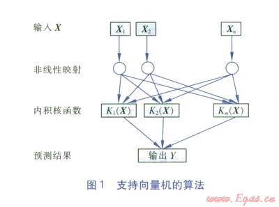 支持向量機(Support Vector Machine)簡稱SVM[8],是一種監(jiān)督式學習的方法,廣泛應用于統(tǒng)計分類以及回歸分析中,其算法見圖1。支持向量機首先通過內積核函數K(X)定義的非線性變換將輸入空間X變換到一個高維空間,然后在這個空間中求最優(yōu)分類面,其輸出Y是中間節(jié)點的線性組合,每個中間節(jié)點對應一個輸入樣本與一個支持向量的內積,因此也被稱為支持向量網絡。研究表明[9-10],相對于神經網絡而言,支持向量回歸模型不存在局部極小值問題,對于解決模糊、隨機、不確定性、樣本數有限和非線性的復雜問題具有明顯優(yōu)勢。支持向量機從結構風險最小化原則出發(fā),為機器學習提供了一個嶄新的方法,被認為是小樣本學習中一種很好的機器學習算法。