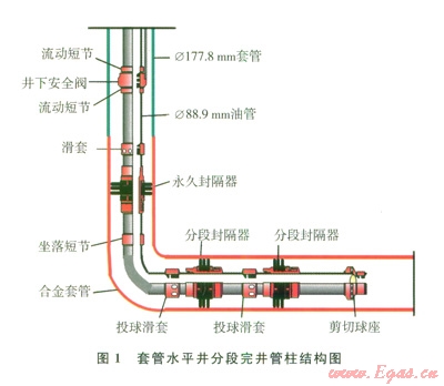 套管完井水平井,采用一趟下入完井管柱,管柱結(jié)構(gòu)見(jiàn)圖l。