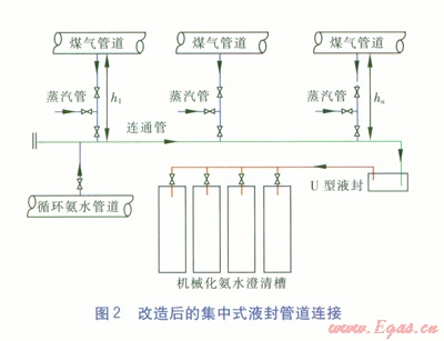 層為焦油,下層為焦油渣,沉淀在槽底的焦油渣由刮板輸送機(jī)排出槽外,焦油則通過液面調(diào)節(jié)器流至焦油槽,澄清后的氨水經(jīng)上部溢流至循環(huán)氨水槽,送往后續(xù)工段使用。改造后的集中式液封管道連接見圖2。