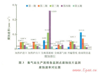 掛片腐蝕監(jiān)測數(shù)據(jù)發(fā)現(xiàn)腐蝕速率超過0.076mm/a的部位主要出現(xiàn)在分離器液相部位,主要原因?yàn)橐合嘀谐煞謴?fù)雜,腐蝕性成分及殘酸等大部分都存在于此,故該處腐蝕相對嚴(yán)重。