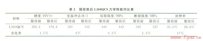 從服役前后管材的力學(xué)性能對比來看(2),管材韌性略有下降、強(qiáng)度略有上升,延伸率相對變化較明顯,但下降不顯著,說明管材的力學(xué)性能保持良好。從沖擊試樣和拉伸試樣的斷口來看,均出現(xiàn)明顯韌窩,沒有脆性斷裂的特征。結(jié)合固溶氫含量的測量結(jié)果,可以判斷,盡管高含硫工況導(dǎo)致管材內(nèi)固溶部分氫,但遠(yuǎn)未達(dá)到損傷管體強(qiáng)韌性的程度,管材可以安全服役。