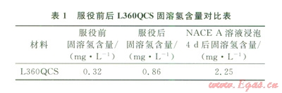 集氣站內(nèi)管道運(yùn)行l年后,截取站內(nèi)管道進(jìn)行力學(xué)性能測試,確定其性能變化情況。將運(yùn)行后的管材進(jìn)行NACE的標(biāo)準(zhǔn)HICSSC試驗(yàn),均未出現(xiàn)開裂。對比測量服役前后以及NACE A溶液浸泡后材料內(nèi)固溶氫含量發(fā)現(xiàn)(1),服役后管材固溶氫含量雖有所增加,但遠(yuǎn)小于在NACE A溶液腐蝕4 d以后管材內(nèi)的固溶氫含量。說明即使在高含硫工況條件下,氫滲透也遠(yuǎn)未達(dá)到飽和,管材氫損傷情況不嚴(yán)重。