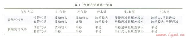 氣舉氣源主要有膜制氮氣和天然氣[7]。鄰井有高壓氣的井選天然氣氣舉,鄰井沒有高壓氣的井選擇膜制氮氣氣舉。膜制氮氣氣舉比天然氣氣舉在注氣量、產(chǎn)氣量、產(chǎn)水量等方面更平穩(wěn)(表1)。