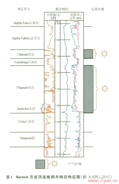 基于技術(shù)和成本方面的考慮,國(guó)外對(duì)頂、底板的研究歷來比較重視[4-5]。北美一些主要的頁巖氣盆地大都具有“三明治”式的展布特征。以美國(guó)福特沃斯盆地著名的Barnett頁巖為例,上Barnett頁巖以Marble Falls石灰?guī)r為頂板,Forestburg石灰?guī)r作為底板,圖1顯示,頂?shù)装逄帨y(cè)井響應(yīng)特征為低自然伽馬值、高電阻率;而上Barnett頁巖段則顯示為高伽馬值、低電阻率的特征,可以明顯區(qū)分。下Barnett頁巖則是以Forestburg石灰?guī)r和Viola石灰?guī)r分別作為頂、底板,相應(yīng)的頁巖氣藏也位于頂、底板之間的含氣泥頁巖層段內(nèi),封閉性較好。頂、底板封閉的含氣泥頁巖段為主力產(chǎn)氣層[6]。