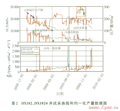 DX182、DX1824兩口井的試采曲線形態(tài)都有一個初始的壓力下降過程,隨著生產(chǎn)進行一段時間之后,二者壓力表現(xiàn)為同步下降。但是,當DX182井關井之后,DX1824井的套壓由逐步下降的趨勢變?yōu)槠骄彛f明DX182井的關井對DX1824井有一個延遲影響。2 009年9月,在兩口井同時關井之后,這兩口井的壓力恢復到一個比較接近的值。最后,對這兩口井壓力、產(chǎn)量進行均一化處理,曲線的趨勢也大體接近[7-8](圖2)。因此,試采曲線表明,DXl82、DXl824兩口井連通。