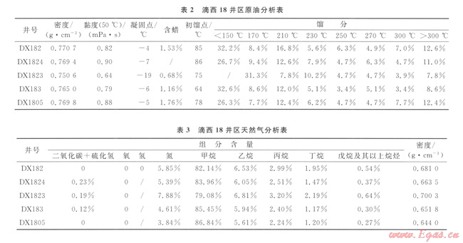 DX183與DX1805井的原油分析表可看出二者在黏度、含蠟量、初餾點、不同溫度下餾分百分比等方面差別都較大,這兩口井在天然氣密度、甲烷、氮氣、二氧化碳這幾個組分的含量上也有較大差異(表2、3),因此,二者所產(chǎn)氣性質(zhì)差別較大,不是同一氣藏,所以DXl83井與DX1805井試采段應不連通。