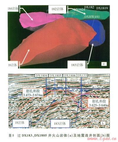 同樣,對地質(zhì)資料分析表明(圖5),DX183井試采井段屬“183”次火山巖體,而DX1805井試采井段屬“18”次火山巖體,可以進一步證實DX1183、DX1805試采井段不連通。