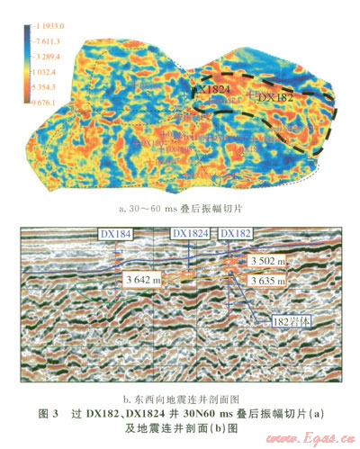 通過地震屬性分析、地震剖面刻畫進行火山巖體輪廓追蹤識別及內(nèi)幕結構精細解釋[10],可以清楚地看到DX182、DX1824井試采井段同屬“182”次火山巖體(圖3),其火山巖儲層的連續(xù)性好,這也從地質(zhì)上證明了DX182、DX1824兩口井連通。